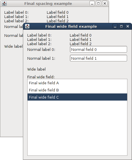 LabelFieldPanel is a JPanel whose layout manager is an instance of LabelFieldLayout. It contains helper addLabel and addField methods to reduce the lines of code necessary to lay out components. The example code above can be reduced to the following with LabelFieldPanel: